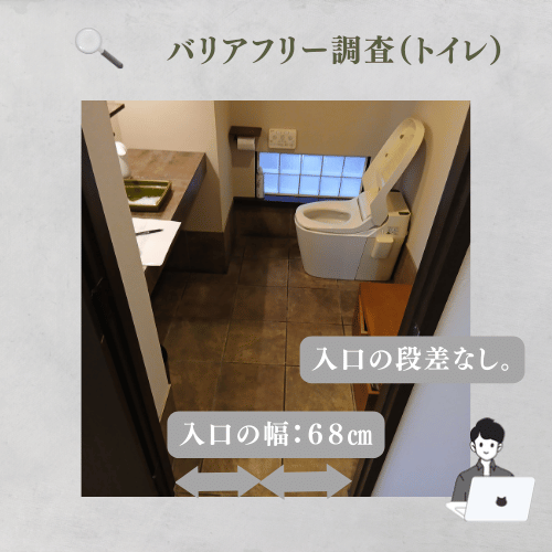 トイレは、手すりが無いのと、トイレ内のスペースは転回難しそうですが、介助者と一緒にトイレに行けば排泄の方は大丈夫そうです。