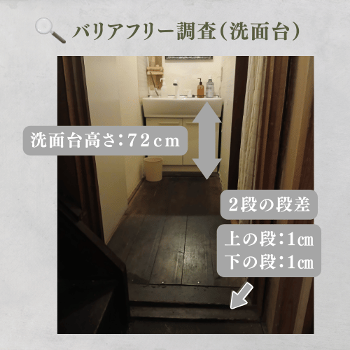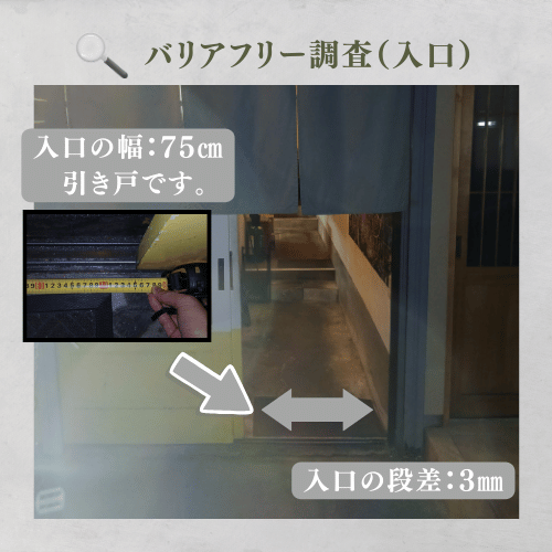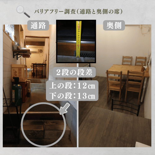 店の奥に段差があります。車いすの方は店内入口の席なら食事を十分楽しめそうです。排泄の事は気になる方は事前に済ませて来店された方が良さそうです。