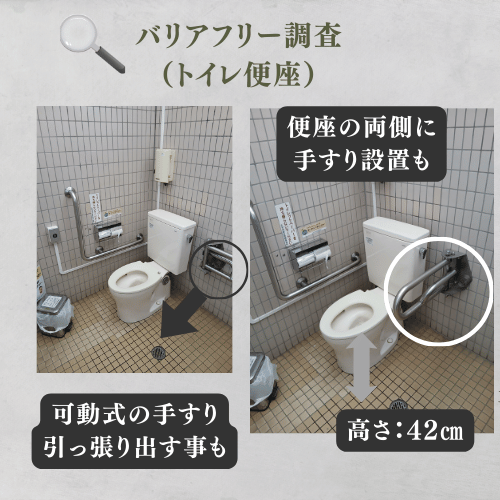 便座向かって左側にはL字の手すり、右側には横手の手すり。