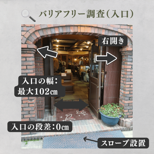 ※車椅子で入店する際に入口の幅が狭くて入らない時はスタッフに声をかけてみてください。写真の様に左右の扉を開ける事ができます。幅が広く段差も無いので、車いすの入店も問題無いと思います。