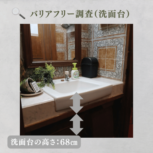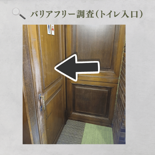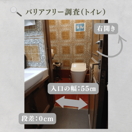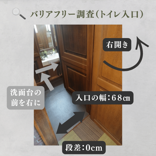段差0cmのバリアフリー設計ですが、入口幅68cm・奥55cmの二重扉構造が特徴です。特に奥の55cmはコンパクトな車椅子でないと進入が困難な事が予想されます。排泄に不安を感じる方は事前に済ませてから入店すると安心して飲食を楽しむことができると思います。押し車や杖歩行の方は段差無いのでスムーズに入室できると思います。