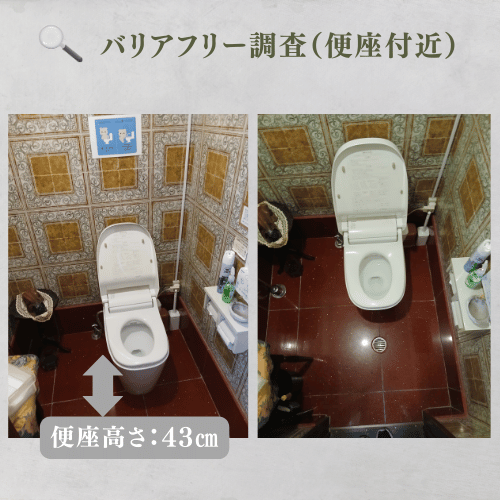 便座高43cmは立ち座りしやすい標準的な高さです。立ち座りが苦手な方は介助者が立ち上がり介助をするスペースはあります。