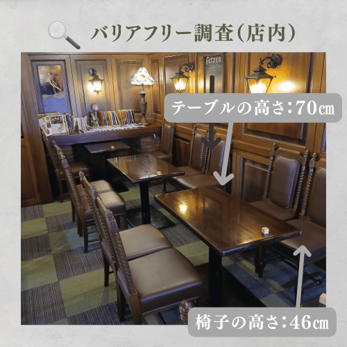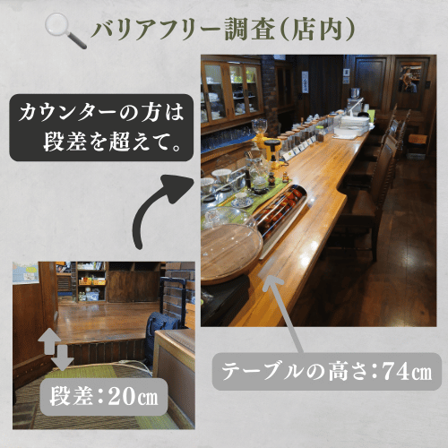 入口からカウンター席までの20cmの段差は、車椅子や歩行困難な方は大変かもしれません。そのような場合はテーブル席の方がおすすめです。