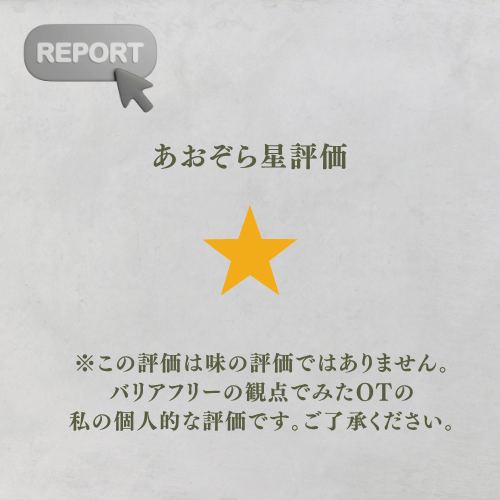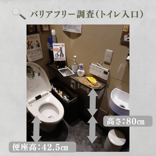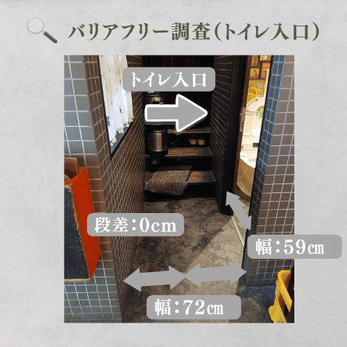 トイレは入口の段差は0cmですが、通路幅72cm、入口幅59cmと非常にタイトです。標準的な車椅子での進入は物理的に困難な事が予想されます。車椅子を使用されている方は事前に排泄を済ませてから入店される方が、安心してお食事を楽しめると思います。