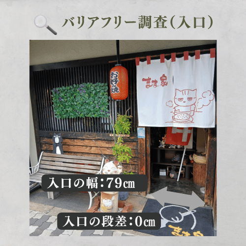 入口幅79cm、段差0cmと導入は良好ですが、進入直後に左への直角曲がりがあるため、車椅子の全長や回転半径によっては切り返しが困難です。特に大型の車椅子は要注意です。押し車や杖歩行の方は問題ないと思います。