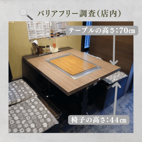 テーブル席はテーブル高70cm、椅子の高さ44cmと標準的な環境です。ただ椅子が固定式なので車椅子の方はカウンター席の方が椅子を外せるので横づけできて楽かもしれません。押し車や杖歩行の方は逆に椅子を動かさなくても良いテーブル席の方が座りやすいかもしれませんね。トイレに行くときは66.5㎝の通路を通らないといけません。