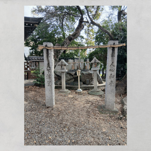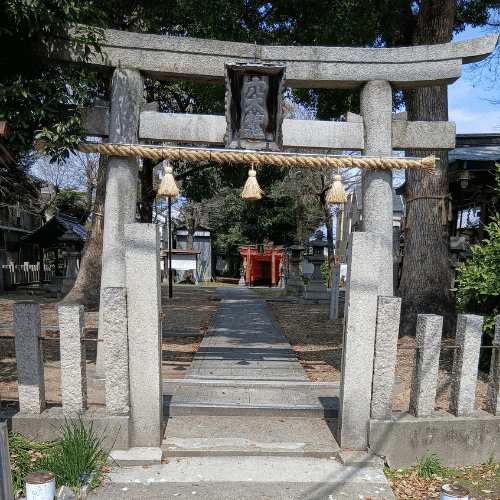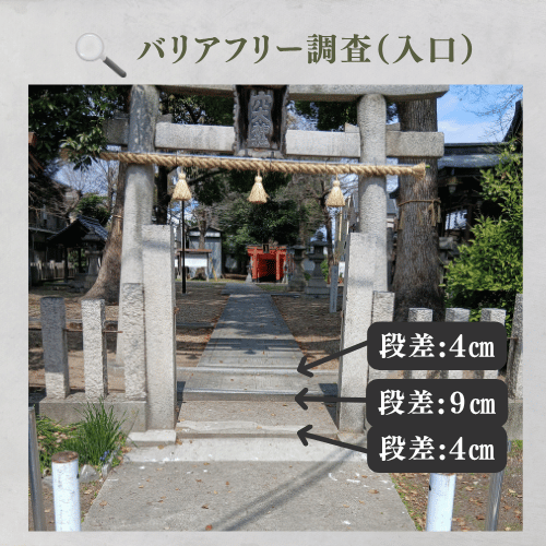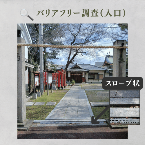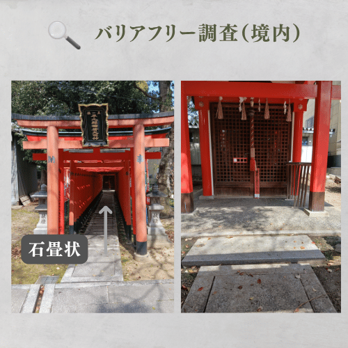 石畳が敷かれた参道は、車椅子や歩行器でもキャスターが取られずスムーズに奥へ移動可能です。鳥居をくぐった先にあるのは末社の社殿。その手前には段が2か所あるので足元にご注意を。