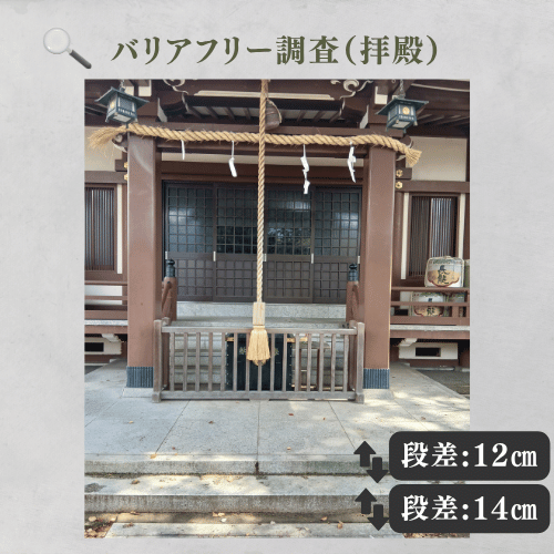 拝殿前の計26cmの段差は車椅子で昇降が困難な事が予想されます。踏面幅も狭いので、手前の平坦な石畳部分を参拝定位置とする方が良さそうです。ここなら安定して落ち着いてお参り可能です。