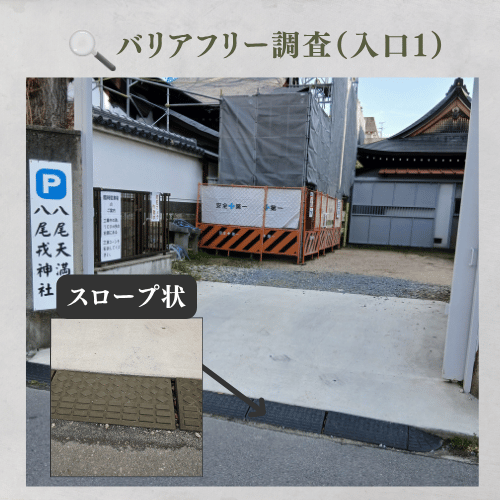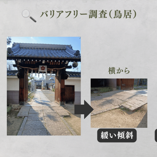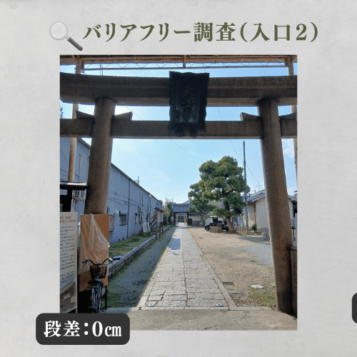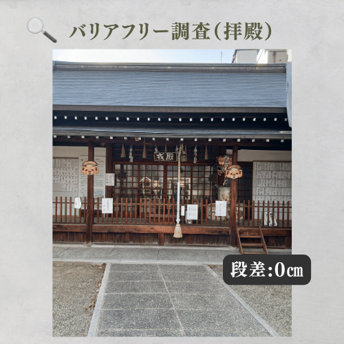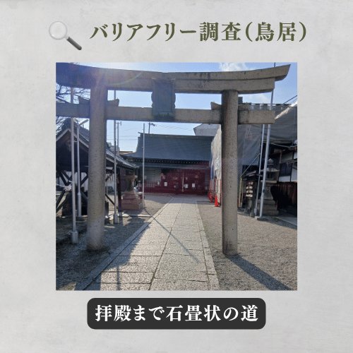 入口の段差は0cmで、車椅子や押し車、ベビーカーでも極めてスムーズに進入可能です。鳥居から真っ直ぐ伸びる「石畳」の参道は、平坦でキャスターの沈み込みもなく、自走・介助ともに最小限の力で移動できます。
