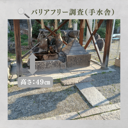 石畳の幅が狭いので手水舎まで歩く際はバランスを崩さないように注意が必要です。高さは49cmと低めで、車椅子の方やお子様も無理なく手が届く優しい設計です。