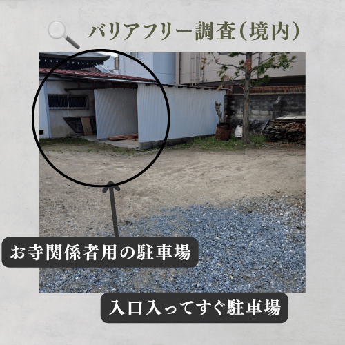 入口直後の路面は、砂利と土が混在しています。車椅子や歩行器ではキャスターが沈み込みやすく、推進力が必要になるかも知れません。特に雨天時はぬかるみによる転倒やスリップのリスクが高まるため、介助者による後方からのサポートがある方が安心です。