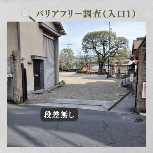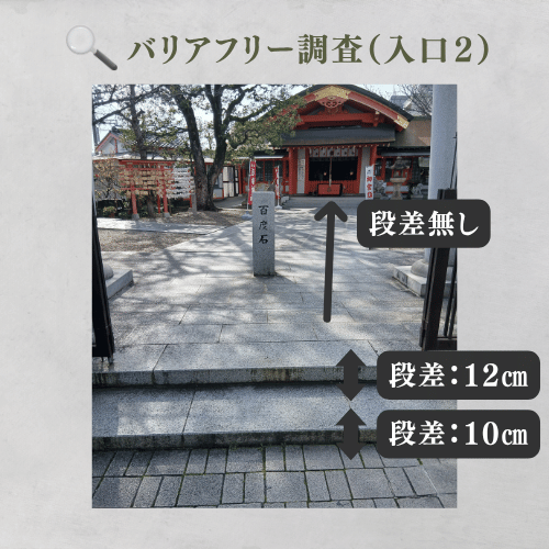 こちらの入り口の場合は拝殿への移動には、手前から10cm、12cmの連続した段差が存在します。これを昇段した後は、拝殿手前まで段差のない平坦な石畳が続いています。車椅子利用者や歩行困難者は、先ほどの入り口からの移動がおすすめです。