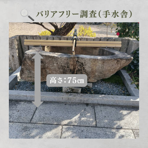 手水鉢の高さは75cm。車椅子利用者の膝が入り込みにくい構造ですが、座ったまま手を伸ばしやすい標準的な高さです。