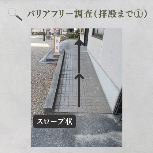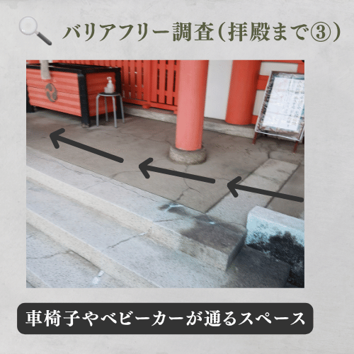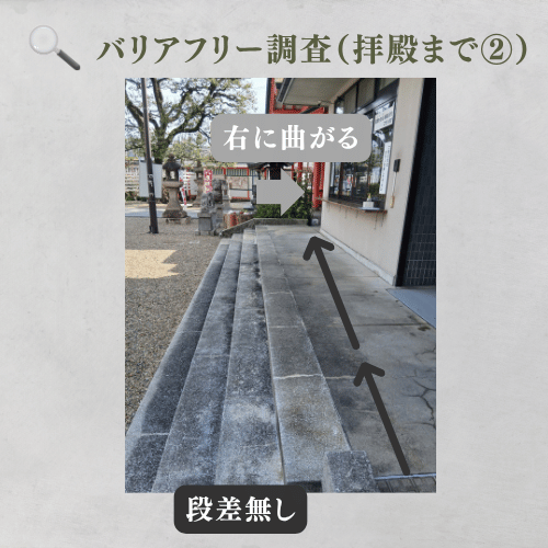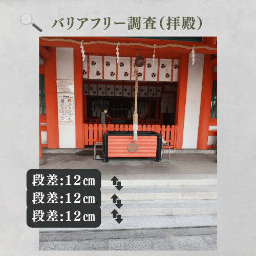 拝殿前には12cmの段差が3段あります。一段の高さは比較的低いものの連続しており、足腰が弱い方やバランス保持が困難な方は転倒リスクがあります。車椅子利用者は横手にスロープが設置されているため、そちらを利用することで、拝殿前までスムーズに移動でき、安全に参拝可能です。