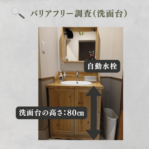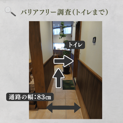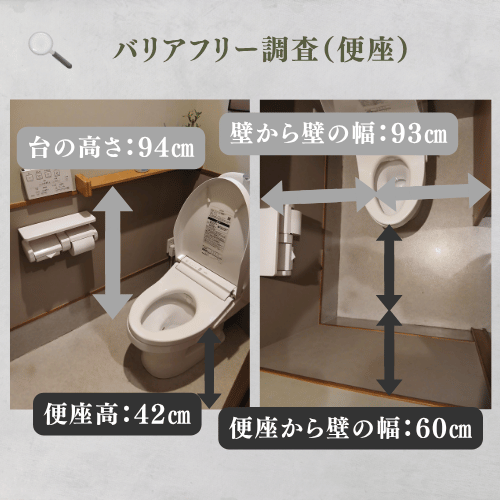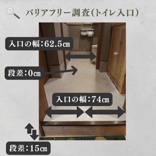 車椅子の方はトイレ手前に15cmの段差があり、ここを乗り越える必要があるのと奥の入口幅も62.5cmと狭まく、コンパクトな車椅子でないと便座の方へ進入するのも困難な可能性もあります。車いすをご利用の方は事前にお手洗いを済ませてからの入店の方が安心して飲食を楽しめると思います。