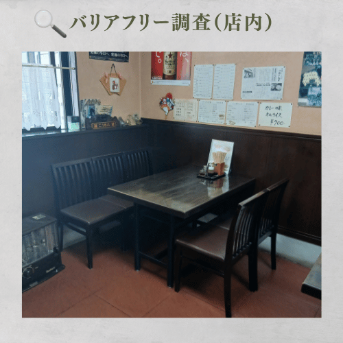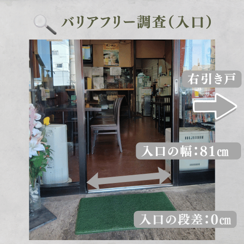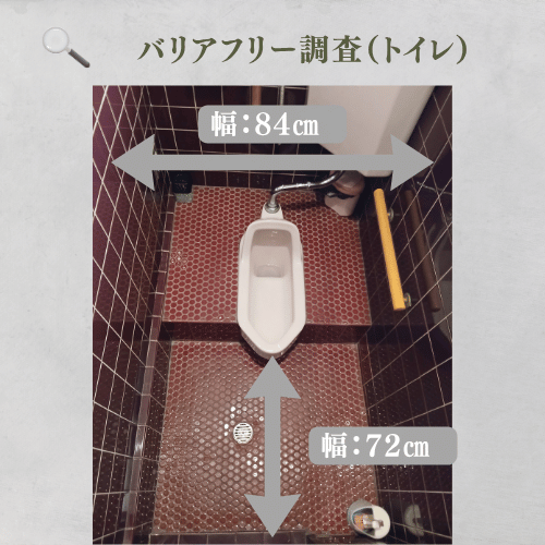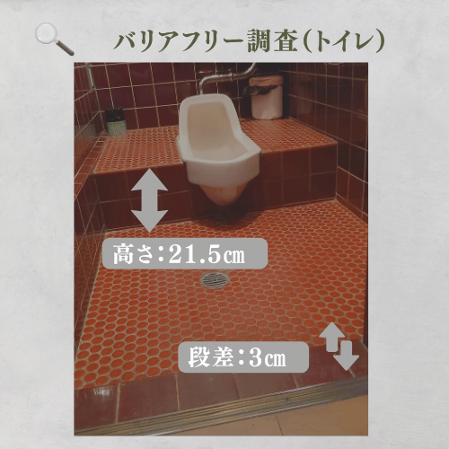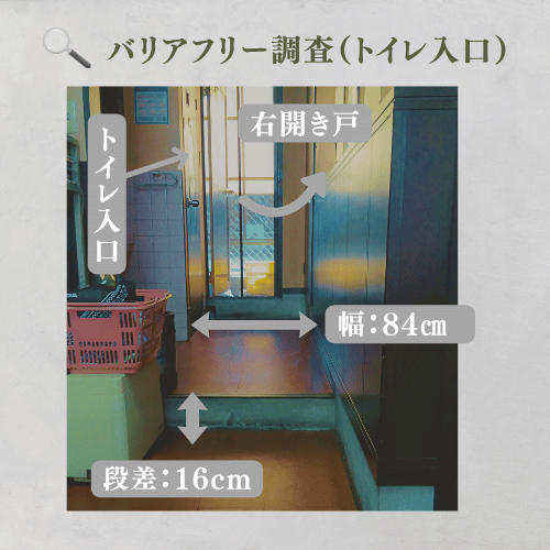 トイレ入口には16cmの大きな段差があり、車椅子や押し車での進入は困難です。また、便座が和式であるため、車椅子ユーザーや足腰に不安がある方は、入店前に排泄を済ませておくと安心して飲食が楽しめると思います。