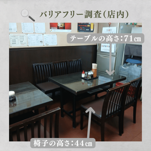 入口は段差0cm、幅広の引き戸。車椅子や押し車、ベビーカーの方に非常に優しい設計です。店内も通路にゆとりがあり、可動式の椅子で食事姿勢の調整もスムーズ。一方、トイレは16cmの段差を伴う和式のため、足腰に不安がある方は入店前に排泄を済ませておくと安心です。店主の温かい配慮も魅力な、全世代で町中華を楽しめる名店です。