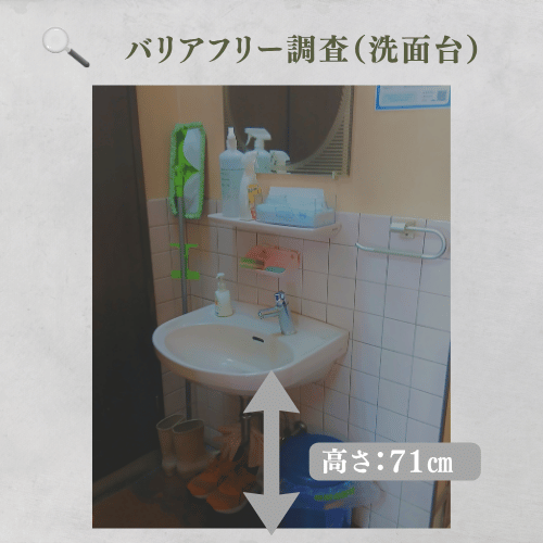 トイレ入口の通路の段差16㎝を上った左手にあります。段差昇降に不安がる方は介助者がいると安心です。