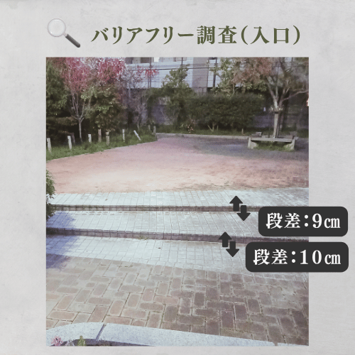 本町第2公園の入口は段差のある所が1箇所あります。9cmと10cmの連続した段差があり、車椅子や押し車での進入は困難です。段差を避けたい場合は別の入口へ回り込みましょう。クランク状の進入で速度抑制が図られており、安全に公園内へ入ることができます。
