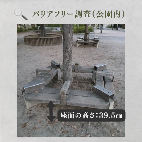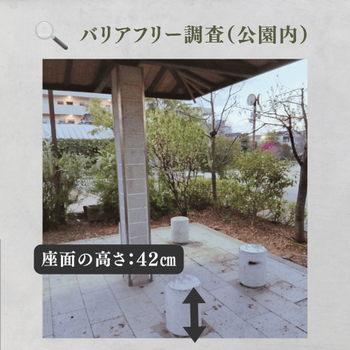 座面高39.5cmと42cmの椅子があります。地面は、木を囲うベンチ周辺は未舗装の土で凹凸がありますが、円柱状の椅子が並ぶ東屋風のスペースは石畳で舗装され、足元が安定しています。