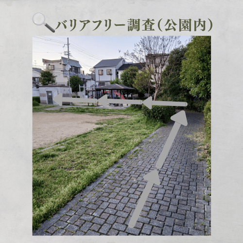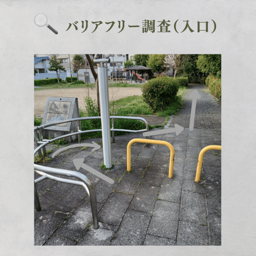 公園のこちらからの入口は通路幅が狭く、車椅子や押し車での進入が困難です。トイレへアクセスする場合は、別の入り口から迂回する必要があります。身体状況に合わせた動線選択が重要です。