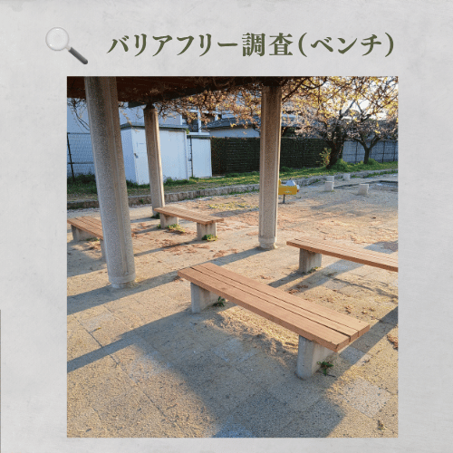 太子堂公園のベンチは、色々な場所に設置されています。車椅子の方も横に並んで一休みできる、開放的で安心感のある椅子の配置です。
