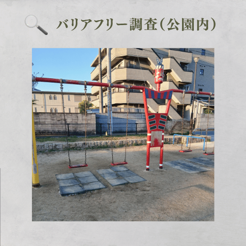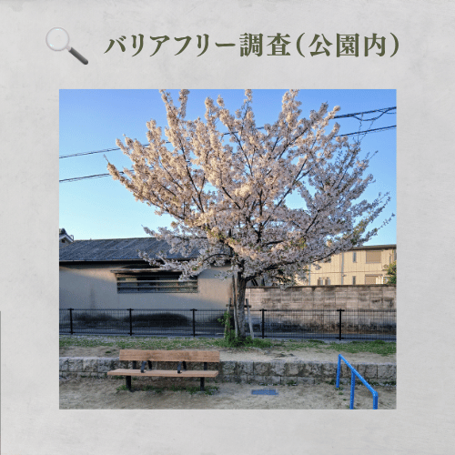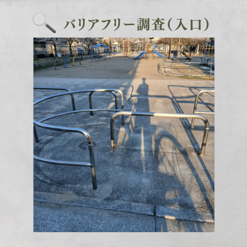 太子堂公園の入口は、バイクなどの進入を防ぐ柵がありますが、車椅子やベビーカーが通り抜けられるスペースは写真の様に確保されています。路面はほぼ平坦で段差がなく、スムーズに公園内に入って行けます。