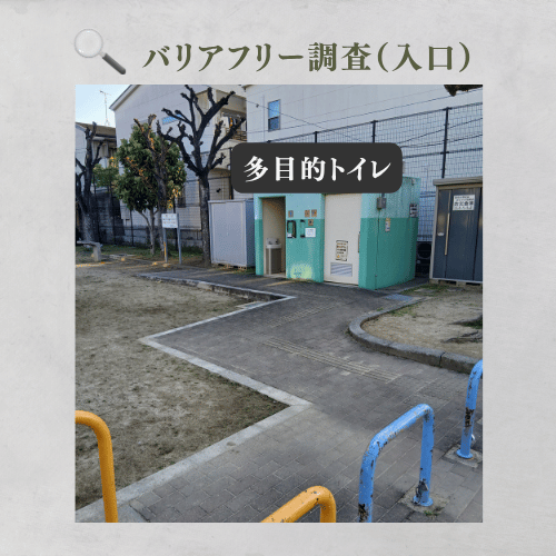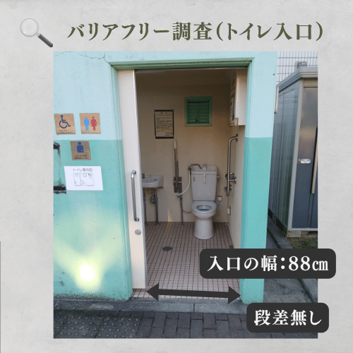 こちらの入り口は段差がなくスムーズですが、多目的トイレまでは少し距離があります。地面は土や草の部分もあるため、車椅子や押し車の方は、路面の状況を確認しながらの移動が良さそうです。