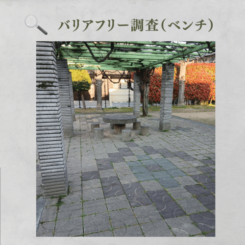 こちらのベンチエリアは地面が平坦に舗装されており、車椅子の方もテーブルを囲んで一緒に休憩できます。他にも公園内には複数のベンチがあり、体調に合わせて一休みできる環境です。
