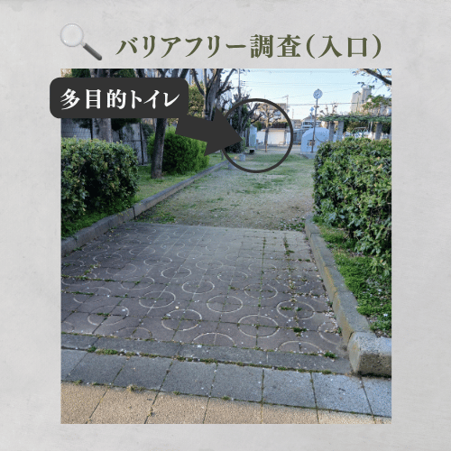 入口1:段差なし(ただし多目的トイレまで距離があり、一部土・草あり)