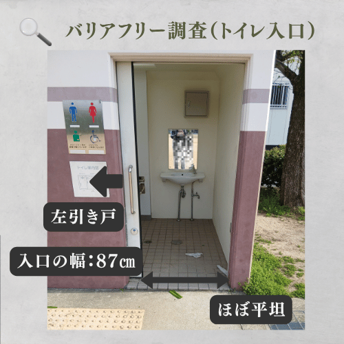 住宅街に位置する静かな公園で、入口からトイレ・ベンチまでの動線がほぼ平坦に保たれているのが大きな特徴です。多目的トイレは、車椅子が旋回しやすい広い入口と、片麻痺がある方でも左右どちらの手でも支えられる両側手すりを完備。足元の不安を最小限に抑え、多世代が日常の散歩や休憩に安心して利用できる良好な環境です。