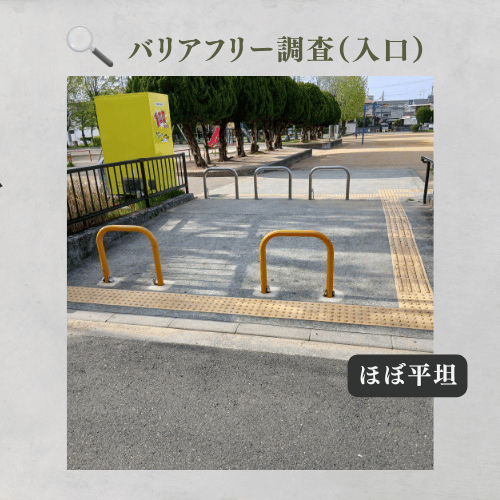 公園入口はほぼ平坦で、車椅子やベビーカーでもスムーズに移動できます。駐輪スペースが隣接しており、地域の方が気軽に立ち寄りやすい設計です。足元の段差が最小限に抑えられているため、小さなお子様から高齢の方まで安心して利用できる開放的な入口です。
