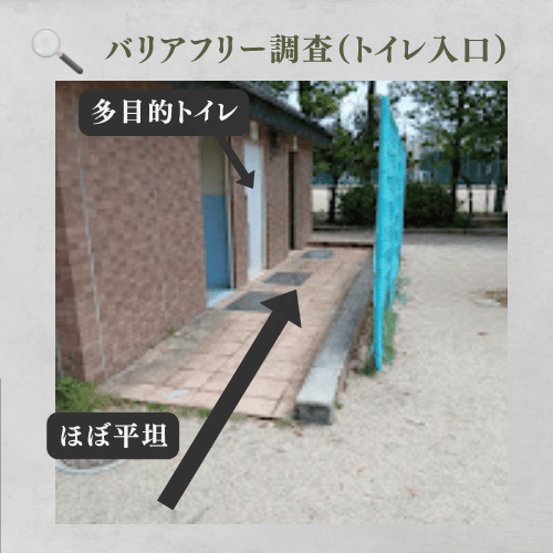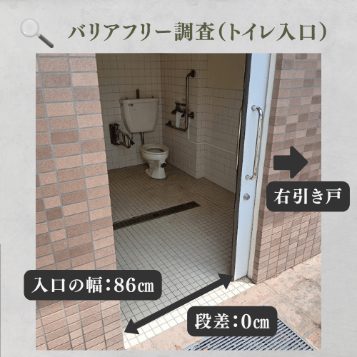 トイレ入口まではほぼ平坦で、入口前もフラットで、86cmの開口幅があるため、大型の車椅子でも引っかかりにくくスムーズに進入できます。