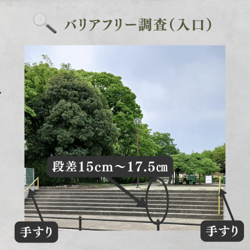 階段ルートには左右に手すりが完備されており、足腰に自信のない方の昇降をサポートしています。一方で、車椅子やベビーカー、歩行器を利用されている方は「段差なしルート」からスムーズに入園可能です。